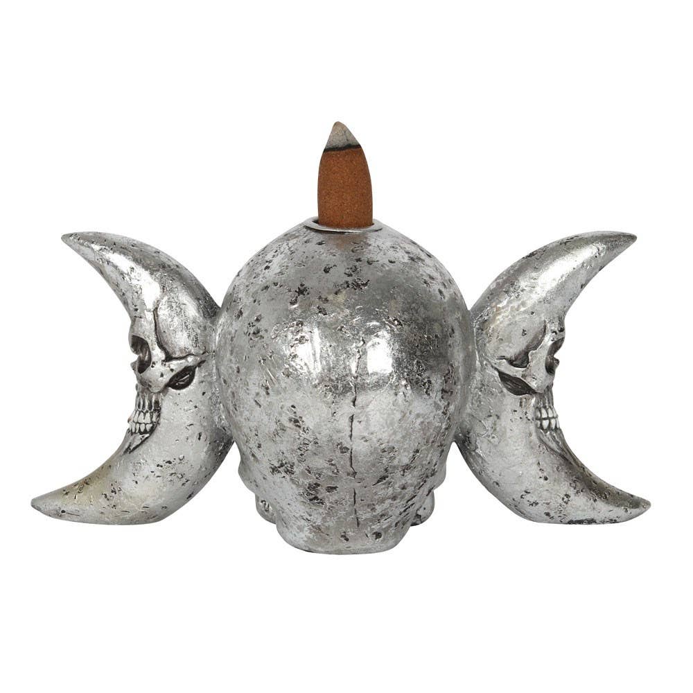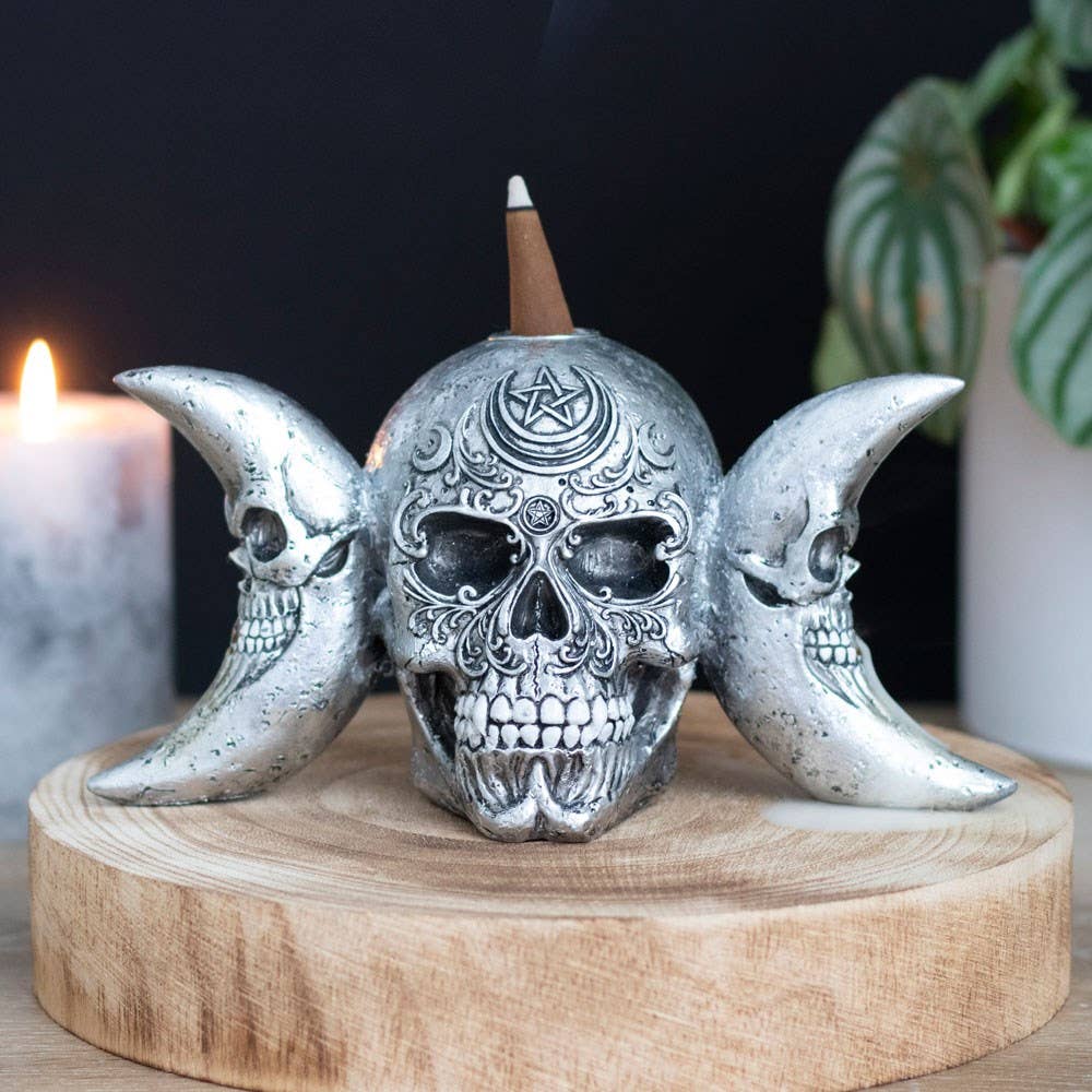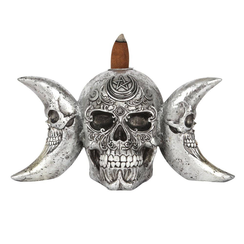 We have collaborated with the popular alternative brand, Alchemy Gothic, to bring their artwork to life in a highly detailed backflow incense burner. 'The Dark Goddess' features a silver triple moon skull with ornate designs. Simply place a smouldering backflow incense cone at the top and watch as mesmerising swirls of smoke trail from each of the three skull moons.
