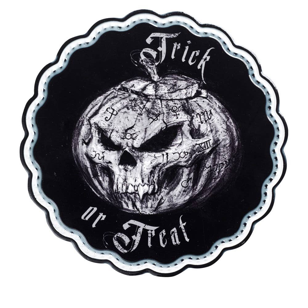 This 'Trick or Treat' trivet/ serving plate is not just for Halloween. Display treats all year round on this darkly beautiful piece. Hide the design beneath your favourite cake and once eaten this surprise pumpkin skull artwork will be the talking point amongst your guests! This unique trivet / serving plate is designed by Alchemy and forms part of the high quality ceramic homewares collection. Ceramic trivet / serving plate, with a non slip cork back, decorated with original Alchemy artwork. Heat Proof & Scratch Resistant.